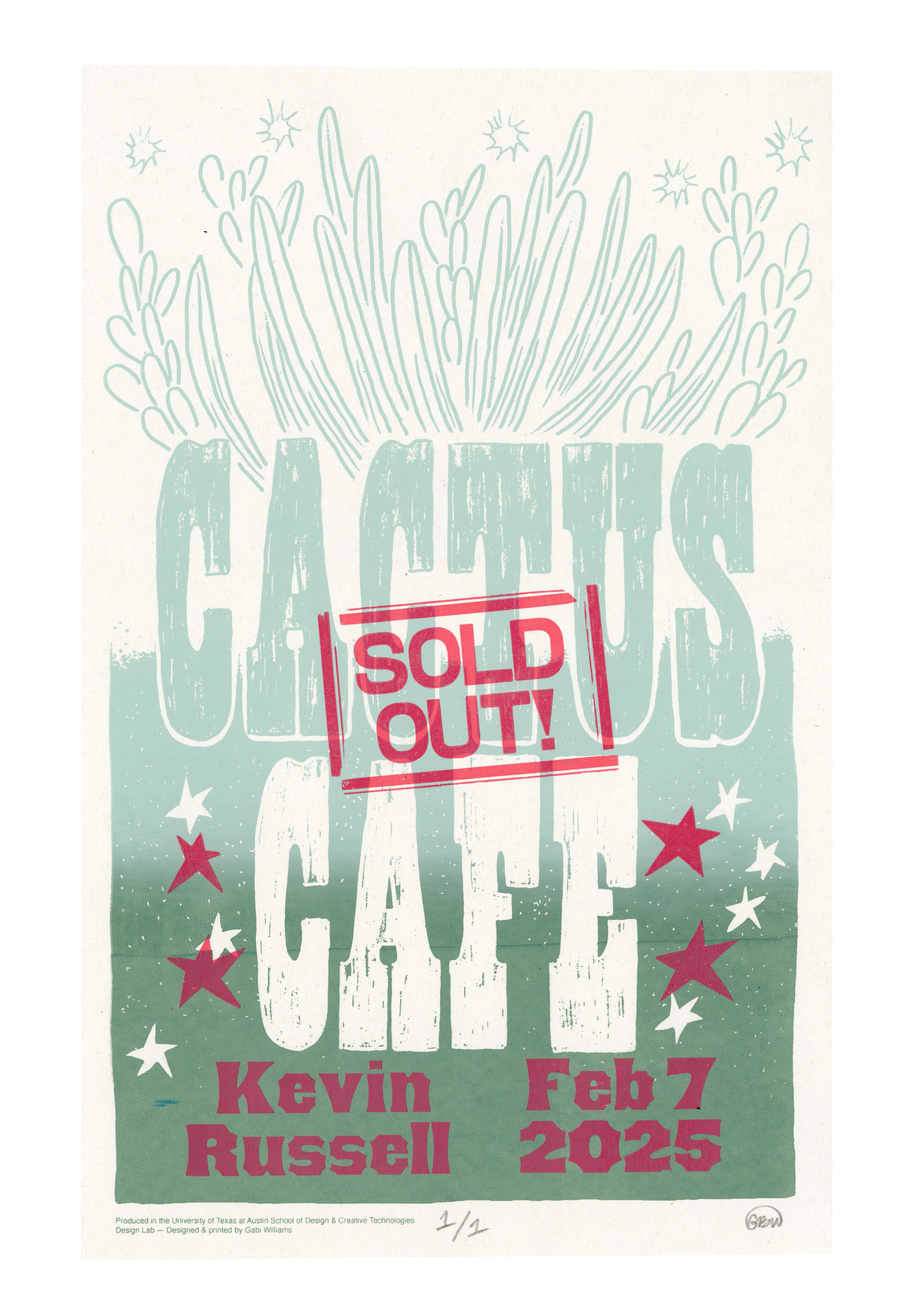 Silkscreen and letterpress poster from series made in collaboration with the Cactus Cafe and Andy Langer, spring break 2025.